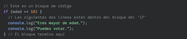 Un bloque de código es un conjunto de una o más instrucciones que se agrupan. A menudo, un bloque define un alcance (scope) para las variables o se ejecuta bajo una condición específica.
