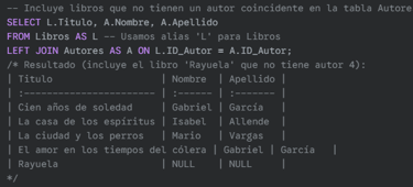 LEFT JOIN (o LEFT OUTER JOIN): Devuelve todos los registros de la tabla izquierda (FROM TablaA), y los registros coincidentes de la tabla derecha (TablaB). Si no hay coincidencia en la derecha, los campos de la tabla derecha serán NULL.