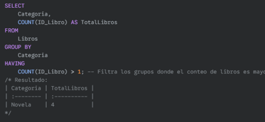 Ejemplo: Contar cuántos libros hay por categoría, pero solo mostrar las categorías que tienen más de 1 libro.