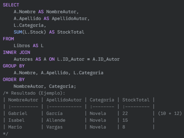 Ejemplo con múltiples columnas en GROUP BY: Calcular el stock total por cada autor y categoría.