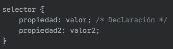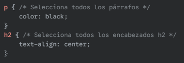 Selector: Apunta a los elementos HTML a los que quieres aplicar estilos (ej. p, h1, .clase, #id).
