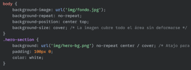 background-size: Tamaño de la imagen de fondo (ej. cover, contain, 100% auto).