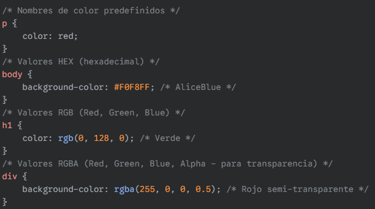 font-size: Tamaño del texto (ej. 16px, 1.2em, 2rem).