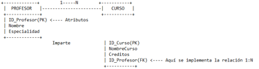 Uno a Muchos (1:N): Una instancia de la Entidad A se relaciona con múltiples instancias de la Entidad B. (Ej: Un Profesor puede impartir muchos Cursos, pero un Curso es impartido por un solo Profesor).