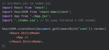Renderizar la aplicación: El componente principal de tu aplicación se renderiza en un elemento HTML raíz (generalmente un div con id="root").