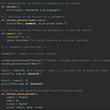 Llamada (o Invocación) de la Función: Es el acto de ejecutar el código dentro de la función. Lo haces utilizando el nombre de la función y proporcionando los argumentos (los valores reales para los parámetros) si los necesita.