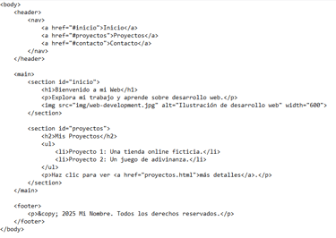 <footer>: Información de pie de página (ej., derechos de autor, enlaces de contacto).