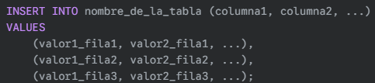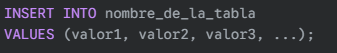 valor1, valor2, valor3, ...: Los valores correspondientes a las columnas listadas, en el mismo orden en que las has especificado.