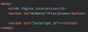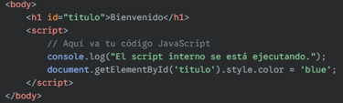 Interno (Internal JavaScript): Se escribe dentro de una etiqueta <script> en el documento HTML. Se suele colocar al final de la etiqueta <body> para asegurar que todo el HTML se haya cargado antes de que el script intente manipularlo.