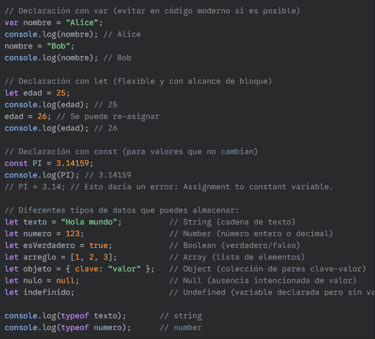 var: La forma más antigua de declarar variables. Tiene un alcance de función (o global) y puede ser re-declarada y re-asignada. (Menos usada hoy en día).