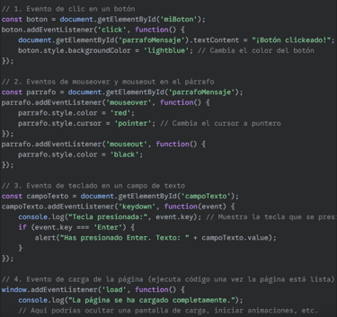 ¿De qué trata? Los eventos son acciones que ocurren en el navegador (ej. un clic de ratón, una tecla presionada, una página cargada, un formulario enviado). JavaScript nos permite "escuchar" estos eventos y ejecutar código en respuesta a ellos, lo que hace que las páginas sean interactivas.
