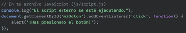 Externo (External JavaScript): Se crea un archivo .js separado (ej. script.js) y se enlaza al documento HTML usando la etiqueta <script src="...">. Esta es la práctica recomendada por las mismas razones que CSS externo: separación de preocupaciones, reusabilidad y mantenimiento.