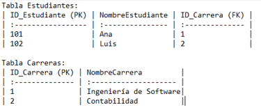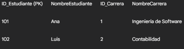 Problema: NombreCarrera depende de ID_Carrera, y ID_Carrera es un atributo no clave de Estudiante (es decir, NombreCarrera no depende directamente de ID_Estudiante, sino de ID_Carrera). Esto es una dependencia transitiva.
