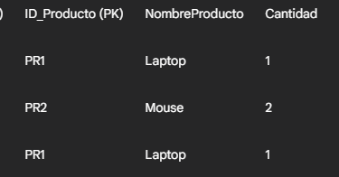 Problema: NombreProducto y PrecioUnitario dependen solo de ID_Producto, no de la combinación ID_Pedido y ID_Producto. Esto genera redundancia (Laptop y 1200.00 se repiten).