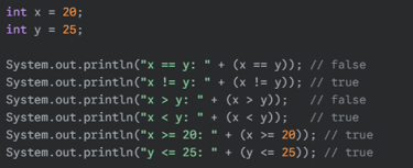 System.out.println("y <= 25: " + (y <= 25)); // true
