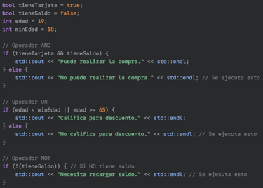Estos operadores se utilizan para combinar expresiones booleanas y producir un único resultado booleano. Son fundamentales para construir condiciones complejas en estructuras de control (como if y while).