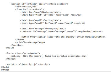 ¡Importante! Enlaza tu archivo CSS (<link rel="stylesheet" href="css/style.css">) en el <head> y tu archivo JavaScript (<script src="js/script.js"></script>) justo antes de cerrar la etiqueta </body>.
