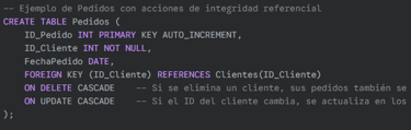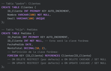 REFERENCES Clientes(ID_Cliente): Indica que esta clave foránea hace referencia a la columna ID_Cliente (que es la clave primaria) en la tabla Clientes.