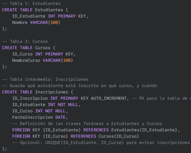 ¿Cómo se hace? Este tipo de relación no se puede implementar directamente con una sola clave foránea. Requiere la creación de una tabla intermedia (o tabla de unión/asociación). Esta tabla intermedia tiene una clave primaria propia (opcional, pero buena práctica) y contiene al menos dos claves foráneas, cada una referenciando la clave primaria de las dos tablas originales.